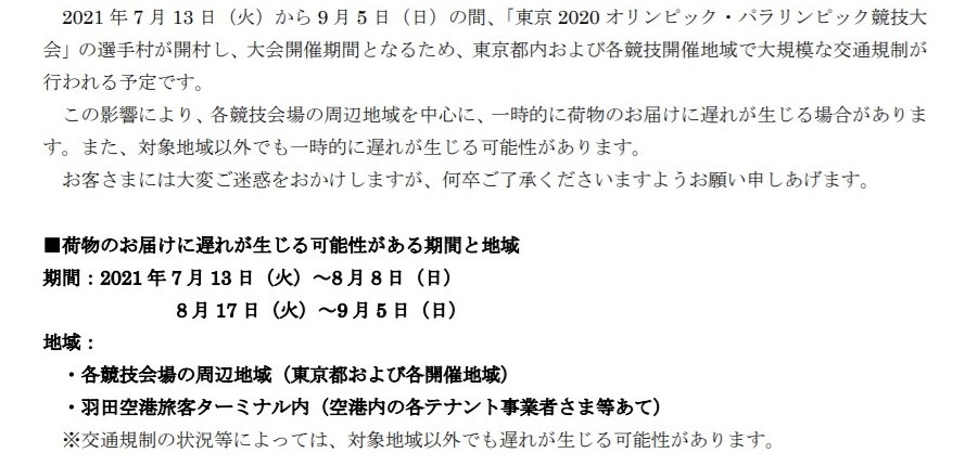 ヤマト運輸さんより、五輪期間で荷物の配送で遅れが生じる可能性を発表しております。